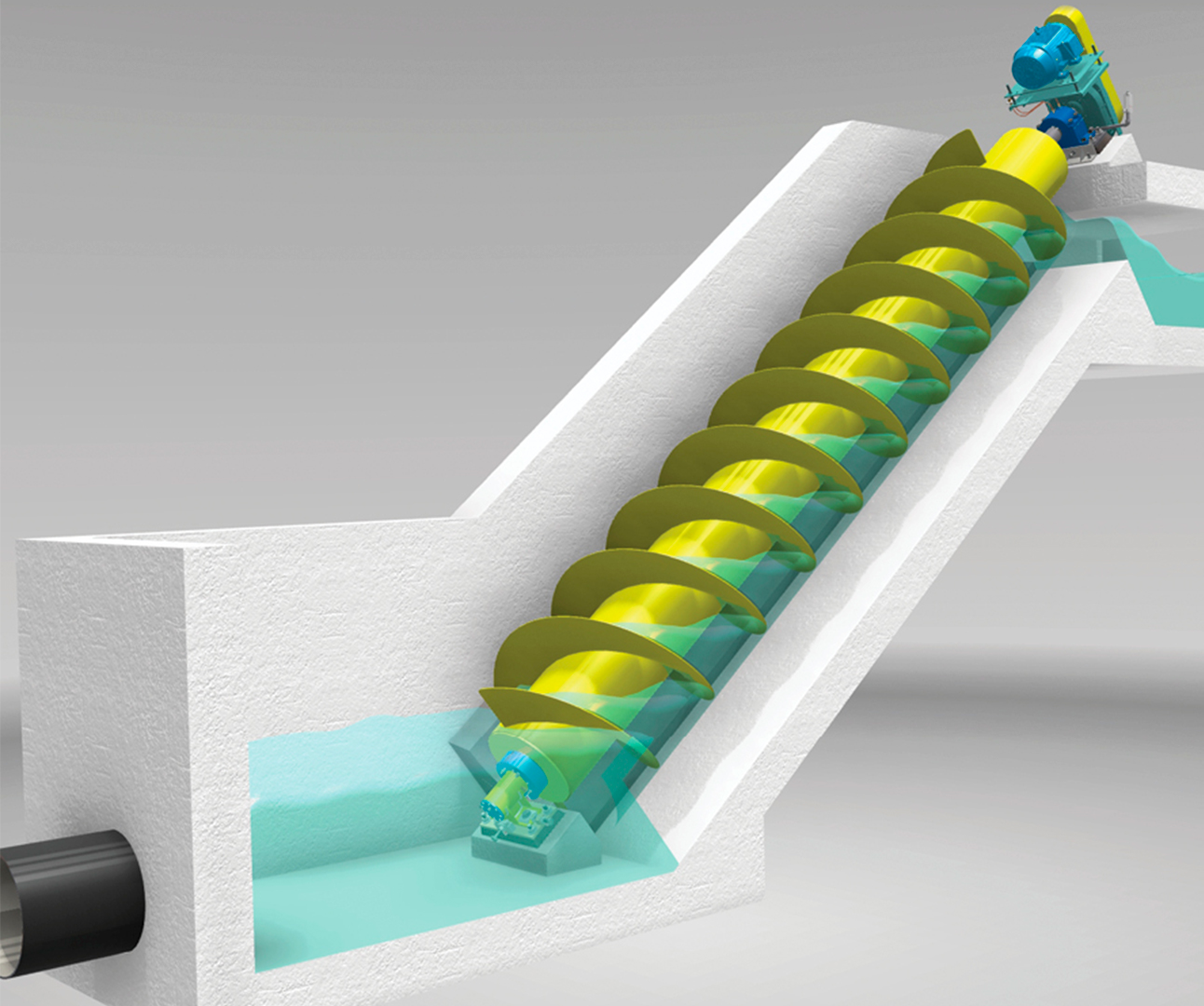 El Tornillo de Arquímedes se sitúa en la zona de pretratamiento de las depuradoras y es la solución ideal para la elevación de aguas residuales, fangos activos o aguas pluviales por su capacidad de manejo de cualquier tipo de materia sólida junto con la posibilidad de conexión con los desarenadores. La sencillez de montaje posibilita un ahorro importante de los costos de instalación de la bomba, tanto en el aspecto constructivo como en el de funcionamiento. La bomba de tornillo Synertech está diseñada para una larga vida de uso por su bajo mantenimiento que, con su alto grado de acabado, posibilitan su gran perdurabilidad. Las características constructivas con rodamientos de lubricación automática y su funcionamiento a velocidades generalmente lentas, facilitan una larga durabilidad..