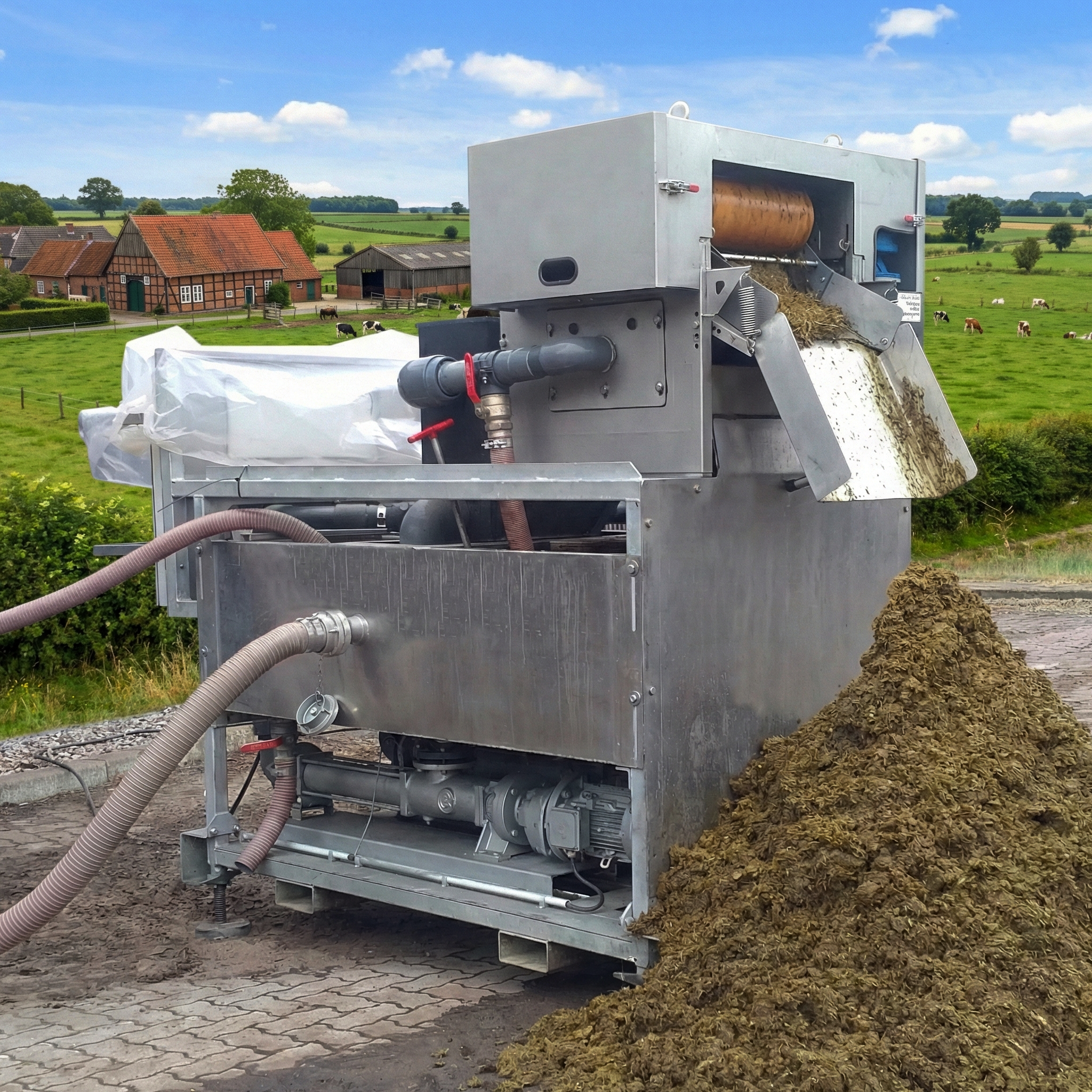 El separador de lodos establece estándares en alta resistencia al desgaste y separación sólido-líquido rentable: dos características clave de la máquina son su alta resistencia al desgaste y bajo consumo de energía en relación con el rendimiento. Los componentes abrasivos del sustrato de estiércol líquido o biogás son principalmente minerales. Por lo tanto, el funcionamiento del separador de tambor se basa en un movimiento de rodadura en lugar de fricción. En el separador de rodillos, unos rodillos pesados y recubiertos de goma utilizan la gravedad para extraer los sólidos del sustrato.