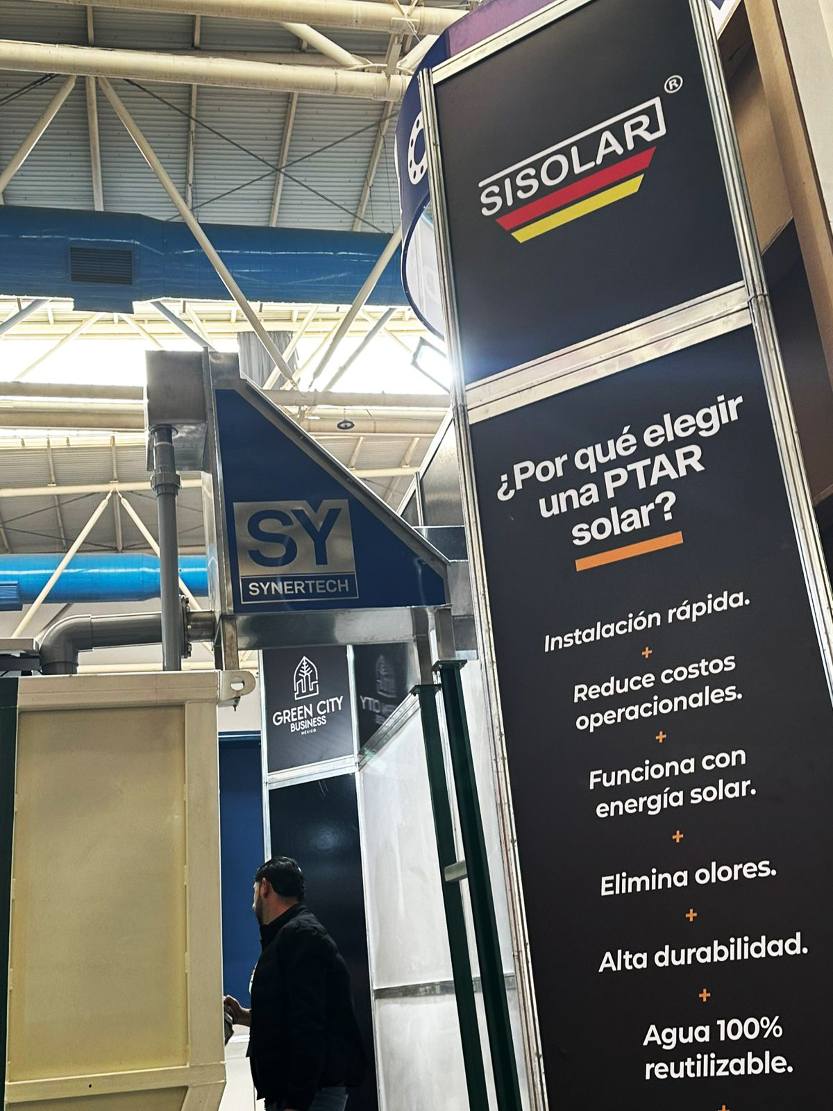 Un punto clave de esta participación fue el acompañamiento de nuestro Distribuidor Autorizado Green City, representado por el Ing. Julio César Lovio, quien hizo presencia en total sinergia con Synertech. Su aporte fortaleció la presentación técnica y comercial de nuestras soluciones en México, garantizando un soporte especializado y una atención cercana para los clientes de la región.