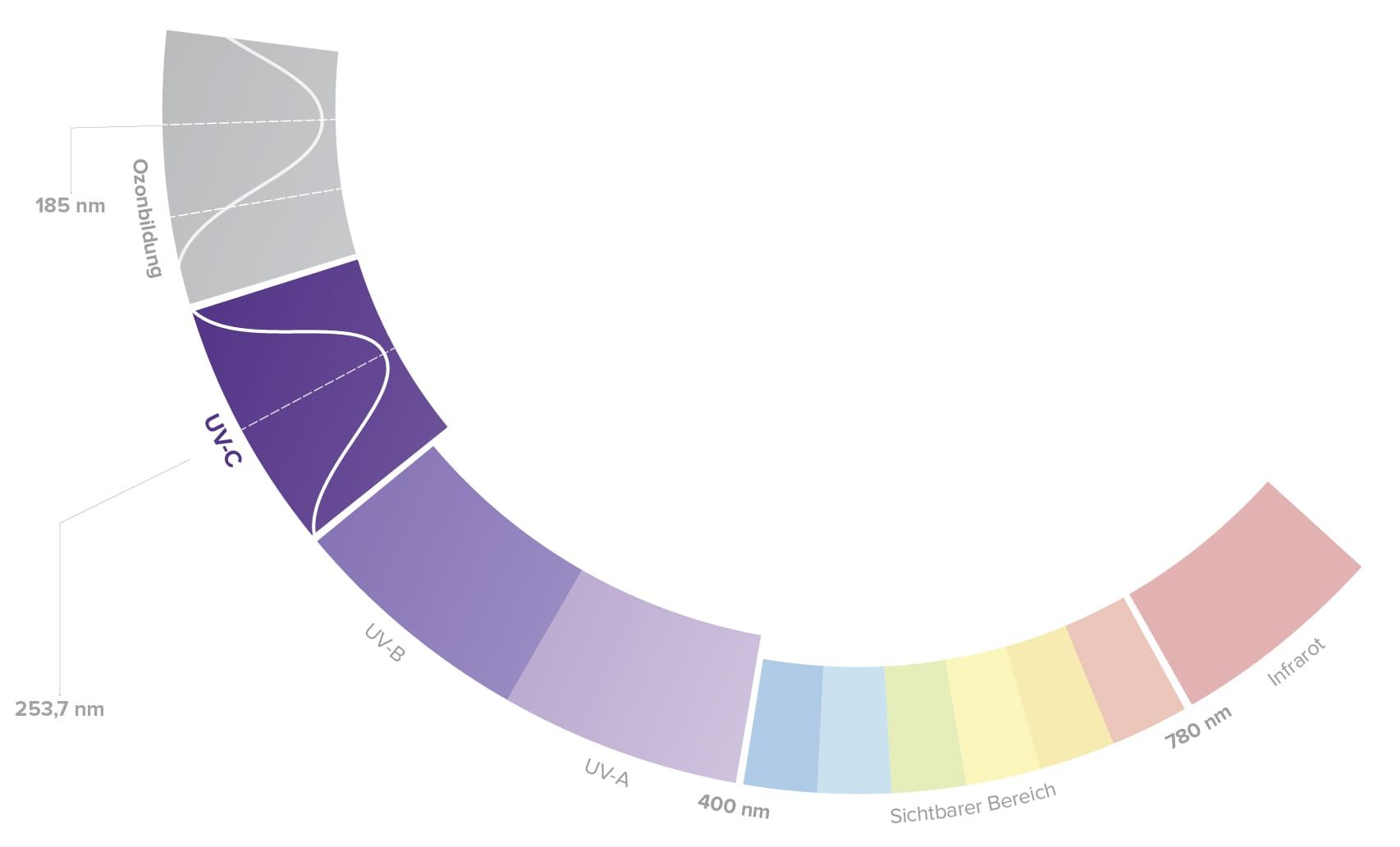 La radiación ultravioleta Al igual que la luz visible o las ondas de radio, la luz UVC es radiación electromagnética y no puede ser percibida por el ojo humano. Por definición, cubre el rango espectral de 100 a 380 nm y, por lo tanto, se une inmediatamente a la parte azul visible de la luz ultravioleta. El espectro ultravioleta cubre longitudes de onda de hasta 380 nm y se divide de la siguiente manera. Con 100 a 280 nanómetros, la luz UVC es el rango de onda UV más corto. Si la capa de ozono está intacta cerca de la tierra, esta área de luz UVC se filtra fuera del espectro del sol antes de que toque la superficie de la tierra. A diferencia de la radiación UV-B, que penetra particularmente profundamente en la piel, hasta ahora no se ha demostrado científicamente una relación causal entre el cáncer de piel y la radiación ultravioleta (UV-C) intensiva.